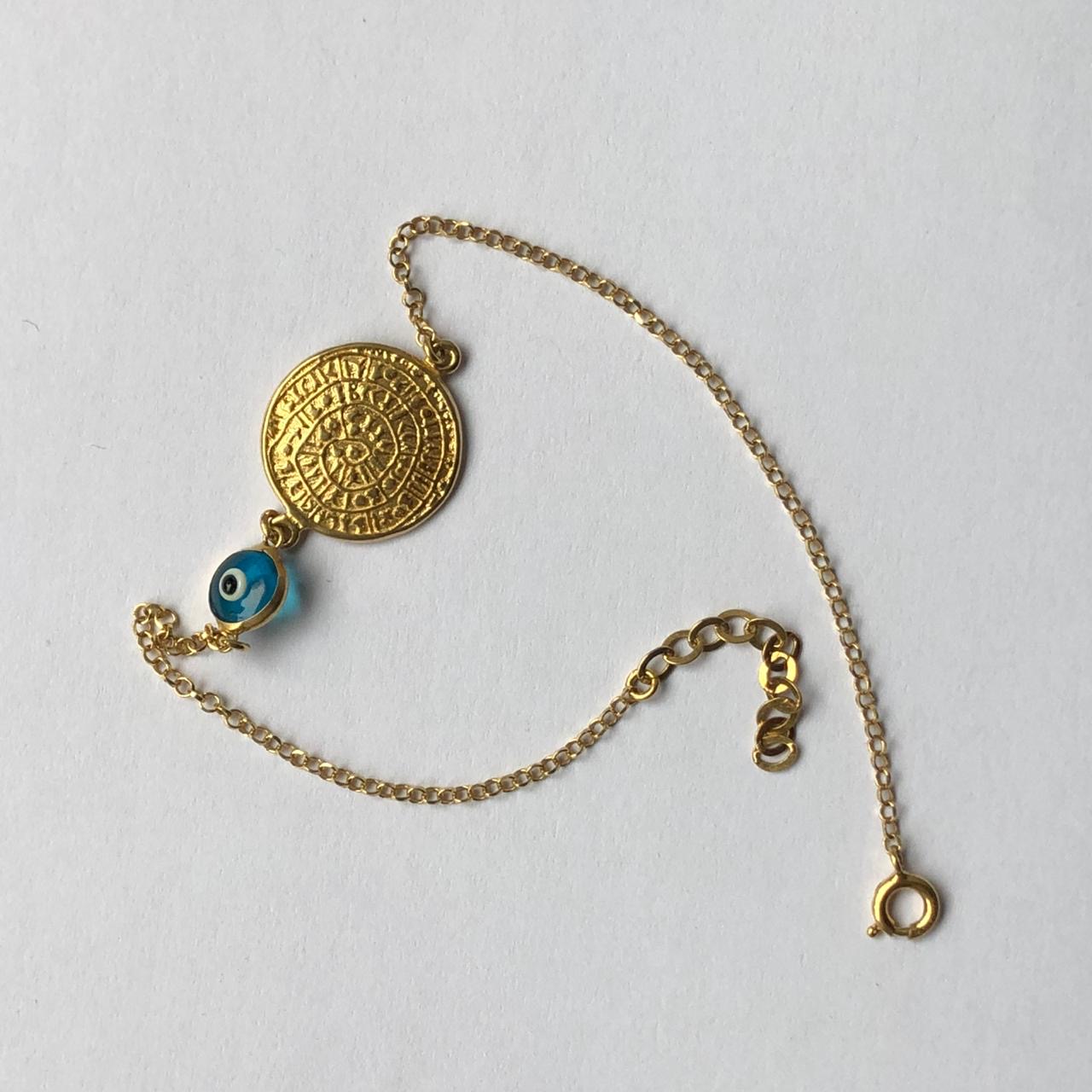 Silver Gold Plated Phostos Large Disc with Light Blue Evil Eye quantity